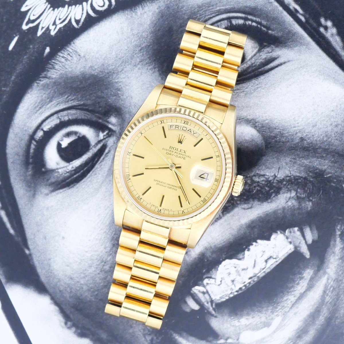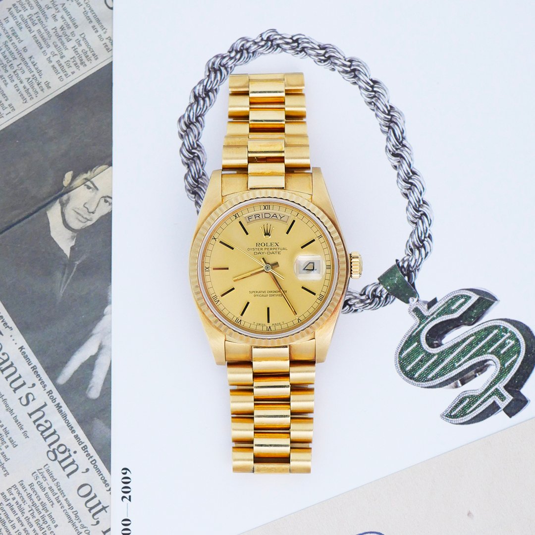 TOO LATE MY FRIEND ROLEX "DAY-DATE" REF.18038 Brand: ROLEXModel: 18038Year: circa 1980Movement : AUTOMetal: yellow gold 18kCase Size: 36mmBox/Paper: – Condition: ExcellentIf you want to purchase this item, send us an email at contact@otottoi.com, and we will send you the steps to follow.
