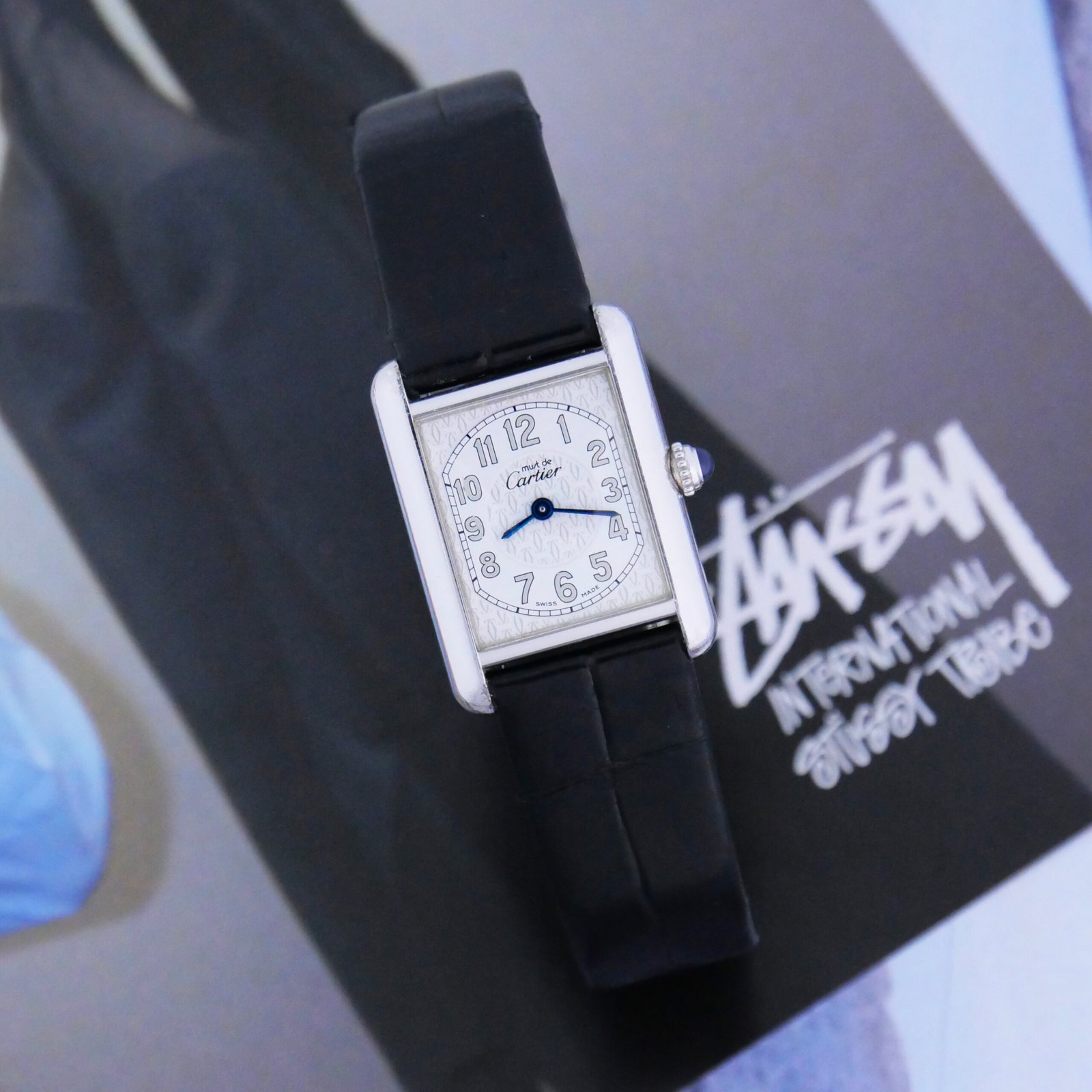 The dial is also super cool, featuring a background pattern based on the Cartier logo.